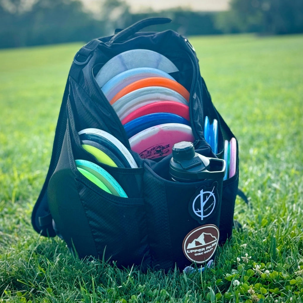 18+ disc capacity with a large center compartment, vertical disc pockets and side mesh disc pockets, Mini disc/ phone holder in top center compartment near carry handle Velcro area on the front water bottle pocket is made for patches and each Shift includes one Upper Park Disc Golf patch (a $7.99 value)